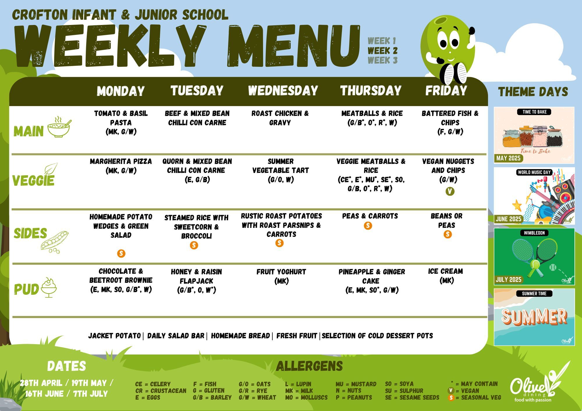 At Crofton schools, we contract Olive Dining to provide all our catering. Menus are rotated on a three week basis and changed each term.